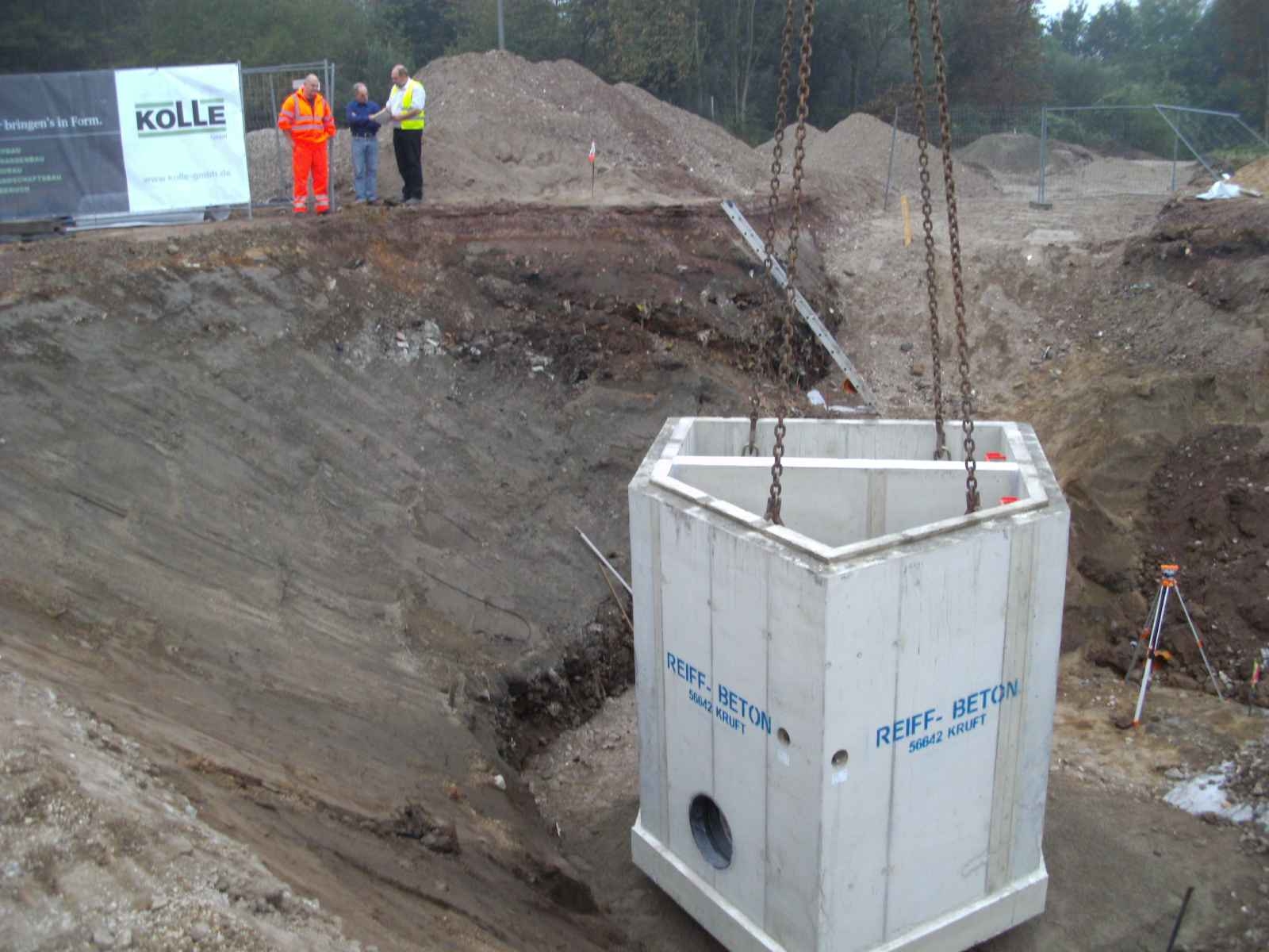 Eine weitere Besonderheit liegt in der Qualität des etwa 35 Tonnen schweren Schachtbauwerks. Die Herstellung erfolgte im Werk der Firma REIFF-BETON in monolithischer Kompaktbauweise. Bei diesem Verfahren werden die Seitenwände in einem Arbeitsgang betoniert, d.h. die Anzahl der notwendigen Arbeitsfugen wird minimiert. Werkseitige Dichtheitsprüfungen im Rahmen der Eigenüberwachung bestätigen die Qualität der Ausführung, und garantieren einen sicheren Betrieb der eingebauten Bauwerkstechnik.