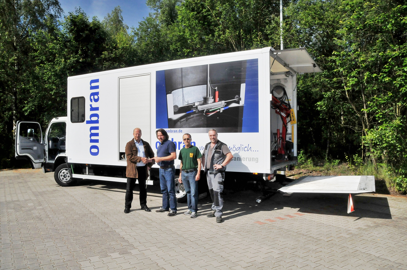 Peter Markolwitz, Vertriebsleiter der HDT Hochdruck-Dosier-Technik GmbH in Bottrop, übergab am 5. Juli 2016 die Schlüssel des Spezial- LKW für die mobile automatisierte Schachtsanierung an ein Team der TST Robotics S.a.r.l., einer 100%igen Tochter der Diringer & Scheidel Rohrsanierung GmbH & Co. KG. Die TST Robotics wird den Spezial-LKW der HDT, die ein Schwesterunternehmen der MC-Bauchemie Müller GmbH & Co. KG ist, sowohl im französischsprachigen Ausland als auch in Deutschland einsetzen.