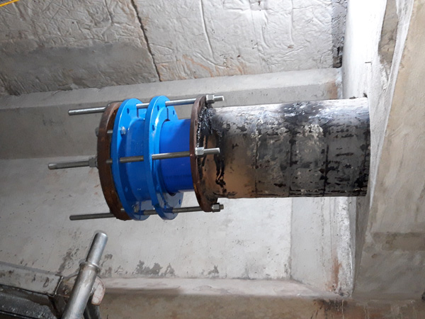 Danach wurden die Abschlussstücke mit DIN-Flanschen PN 10 montiert. Der erfolgreiche Drucktest für den sanierten Abschnitt wurde mit Trinkwasser und einem Druck von 9 bar ausgeführt. Anschließend wurde das Rohr mit HDPE Rohrstücken wieder ans Netz angeschlossen.
