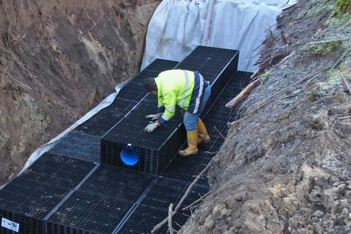 Nach dem Auskoffern erhielt die Mulde eine Sohle aus Splitt, die im nächsten Arbeitsgang mit Vlies ausgelegt wurde. Hierauf verlegten die Arbeiter in drei Reihen nebeneinander und in zwei Lagen übereinander einen rund 50 m langen Stauraum aus D-Raintanks®, wobei die mittleren Elemente in der oberen Lage mit einem Spülsystem ausgestattet sind. Auf diese Weise lässt sich der Rigolenkörper jederzeit mit der Kamera befahren oder reinigen. Der Zugang erfolgt über einen zusätzlich eingebauten Reinigungsschacht. Danach wurden die D-Raintanks® mit dem Vlies ummantelt und mit einer circa 30 cm dicken Schicht des D-Rainclean®-Substrates bedeckt. „Damit sind selbst bei Starkregenereignissen die notwendigen Voraussetzungen getroffen, um eine zuverlässige und für das Grundwasser unbedenkliche Entwässerung zu gewährleisten“, erklärt Erpenbeck, der die Platzersparnis durch den Einsatz von D-Raintanks® und D-Rainclean®-Substrat zwischen 30 und 60 % ansetzt.