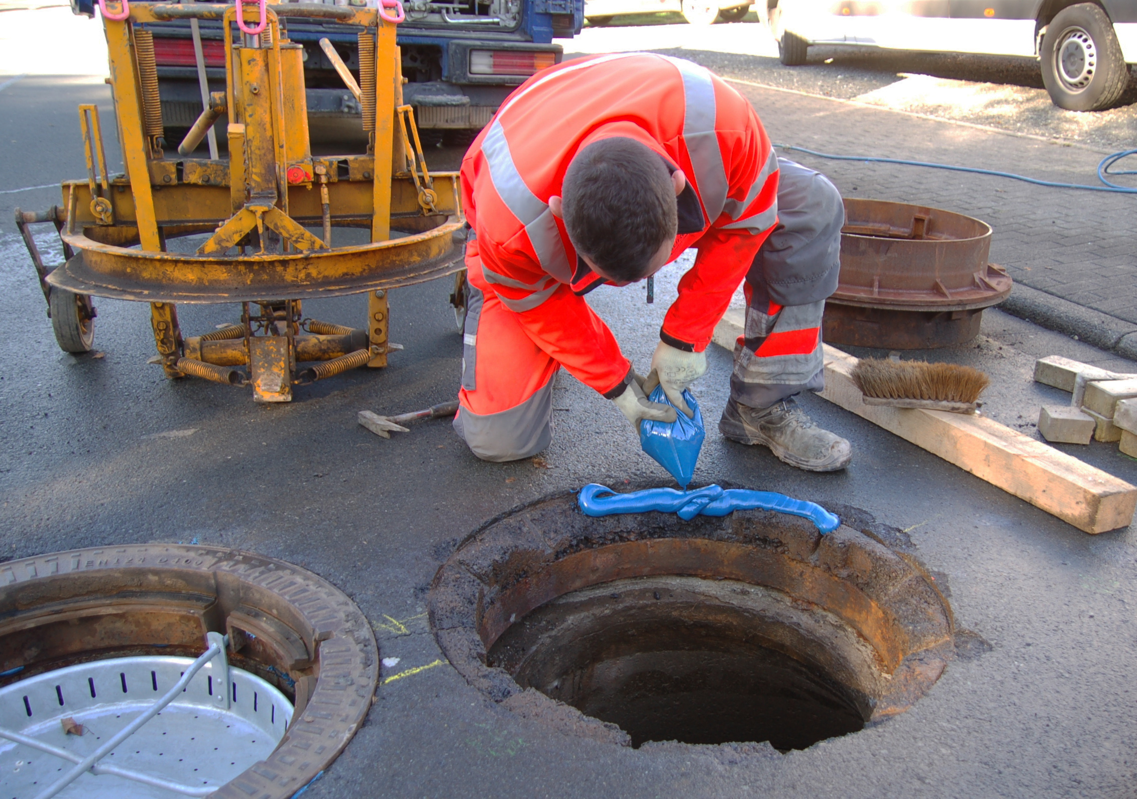 Die Gemeindewerke Burbach sind ein zertifizierter Betrieb für die Anbindung von Schlauchlinern mit dem flexiblen Epoxidharz Harz8 der resinnovation GmbH. Meik Pistor, Sachbearbeiter Kanalbau und –betrieb von den Gemeindewerken Burbach, weiß um die Stärken des roten Epoxidharzes, deshalb entschied er sich für die Sanierung zweier besonders sanierungsbedürftiger Schachtabdeckungen für dessen blauen "Kollegen" FlexyPox, der die gleichen Eigenschaften mitbringt und speziell für die Schachtrahmenregulierung entwickelt wurde.