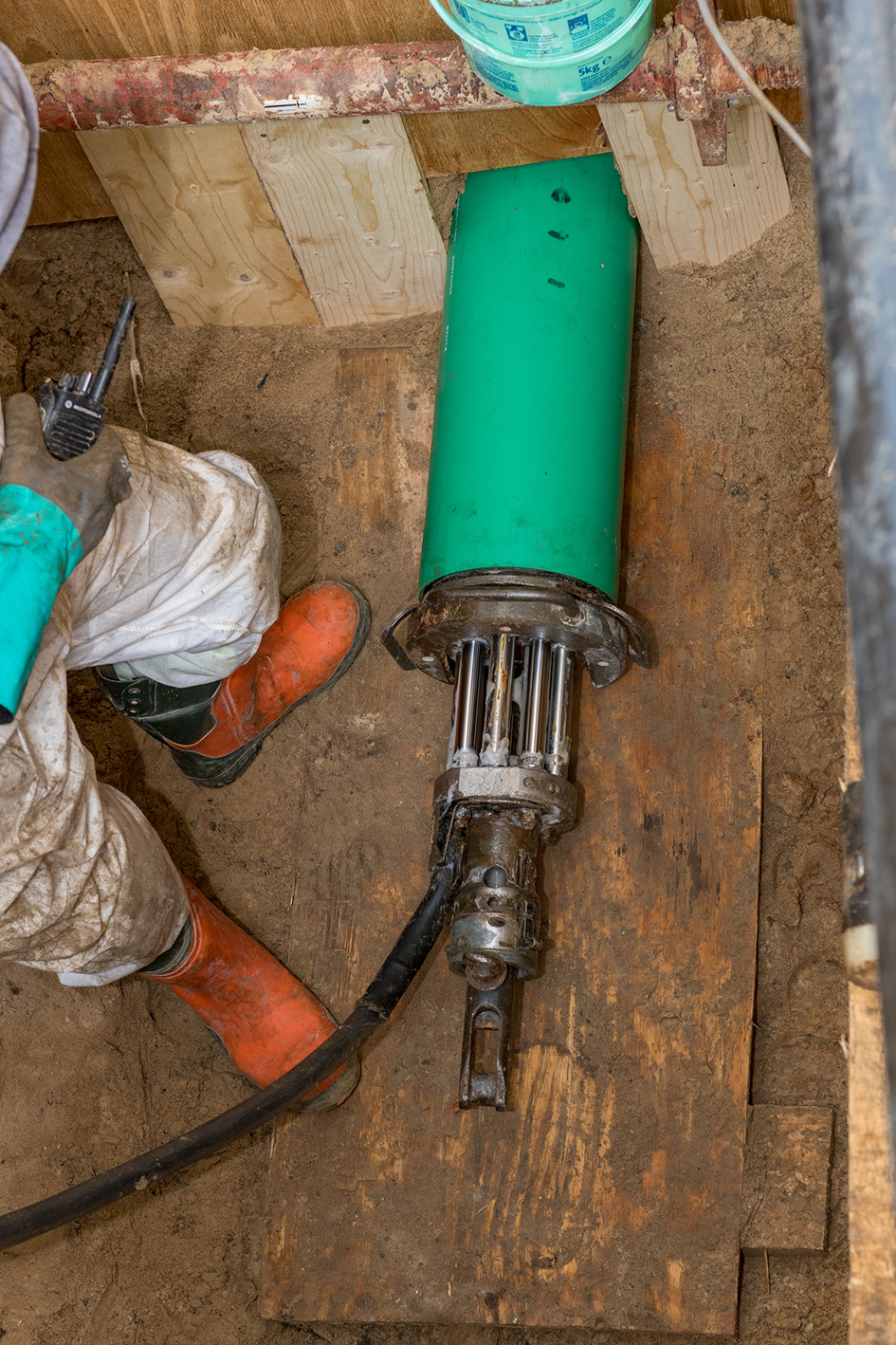 Einbau erschütterungsfrei Nach der Montage von Messerkopf und Aufweithülse zieht die hydraulisch betriebene Zuglafette das gesamte Gestänge inklusive der neuen Rohre bei gleichzeitiger Aufweitung der vorhandenen Betonrohre wieder zum Startpunkt zurück. „Durch den Messerkopf und die Aufweitung wird die alte Leitung geborsten und ins umliegende Erdreich gedrückt“, erläutert D&S-Polier Matthias Spatzier.