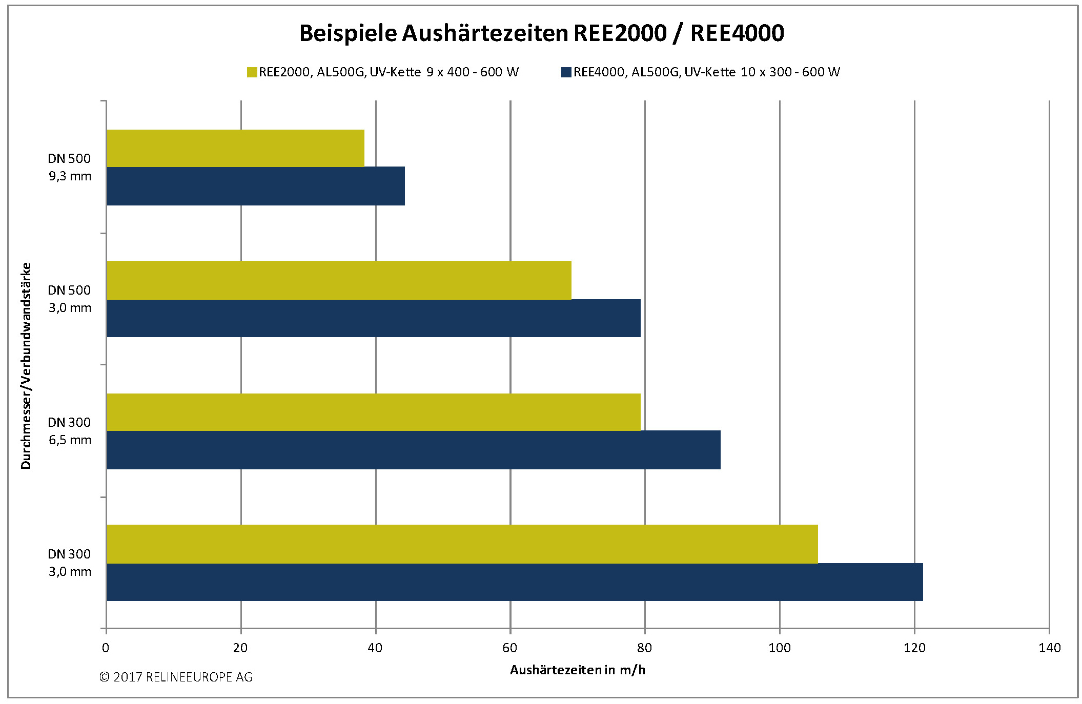 Die Geschwindigkeitsvorteile dieser Technologie verdeutlicht folgendes Beispiel: Mit der REE4000 und der UV‐Kette mit 6 x 3000 Watt wird ein GFK Schlauchliner Alphaliner500G der Dimension DN 700 und einer Wandstärke von 4,4 mm mit einer Geschwindigkeit von 2,46 Metern/Minute und damit einer Stundenleistung von fast 150 Metern ausgehärtet. Im Vergleich zur Aushärtung mit der bewährten REE2000 mit 6 x 2000 Watt Leistung bedeutet dies eine Steigerung der Aushärtegeschwindigkeit um ca. 150 Prozent.