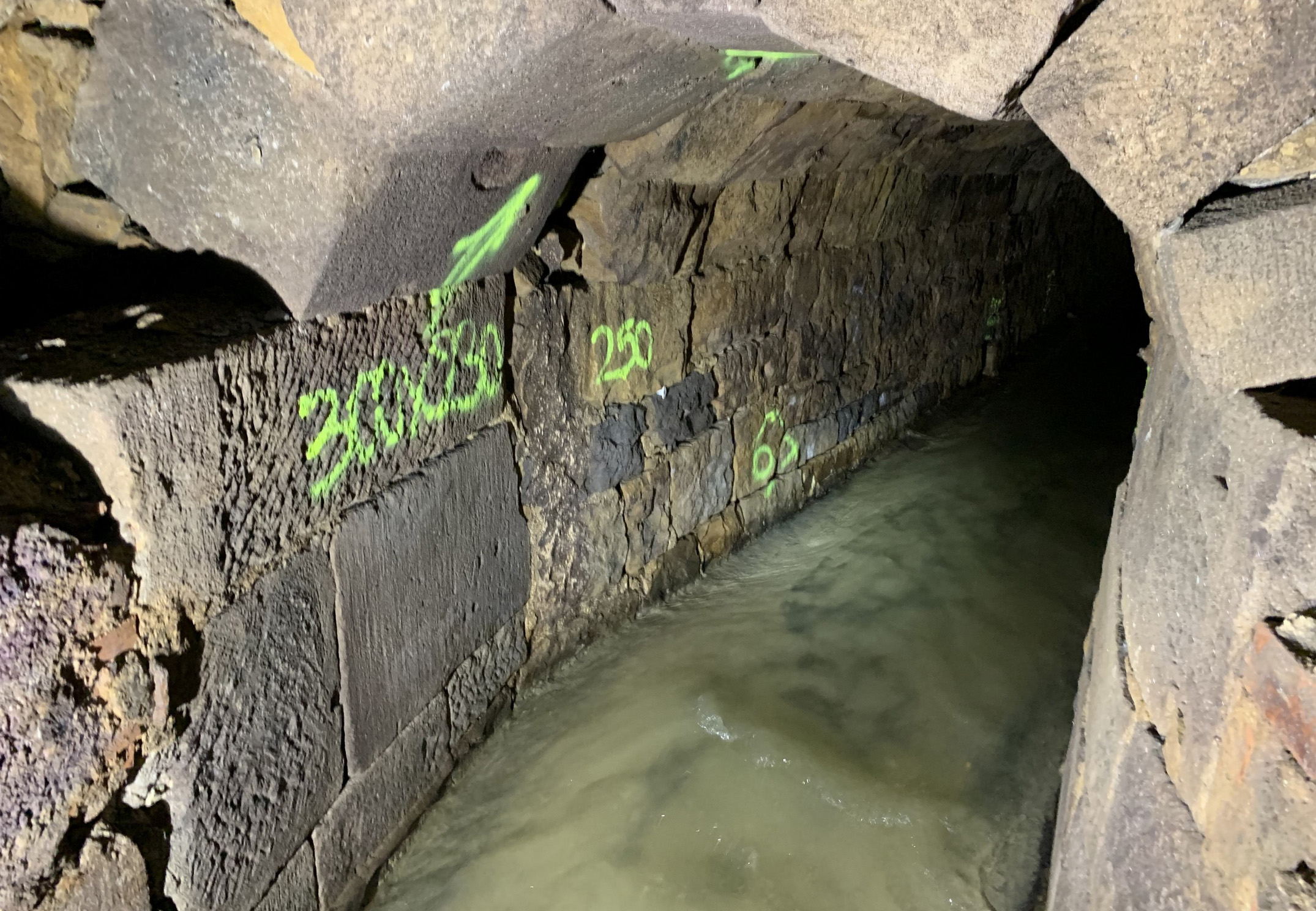 Eine TV-Inspektion inklusive 3D-Bestandsvermessung sowie eine Begehung des Kanals im Rahmen der erweiterten Zustandserfassung dienten als Grundlage für die Planung der umfangreichen Sanierungsmaßnahme. Statische Nachberechnungen zur Resttragfähigkeit der Altrohre ergaben einen guten Zustand. Davon ausgenommen war ein Gewölbe mit einem ebenfalls verdeckten Schacht. Diesen galt es aufzugeben und zu verfüllen. Das Hauptschadensbild im Rohr selbst stellten die ausgewaschenen Fugen mit Hohlräumen innerhalb des Kanalabschnittes dar – vor allem im Wandfußpunkt und den Seitenzuläufen. Als Ursache hierfür wurde – neben strukturellen Schäden – auch die sehr hohe Fließgeschwindigkeit des Mischwassers in diesem Bereich identifiziert.