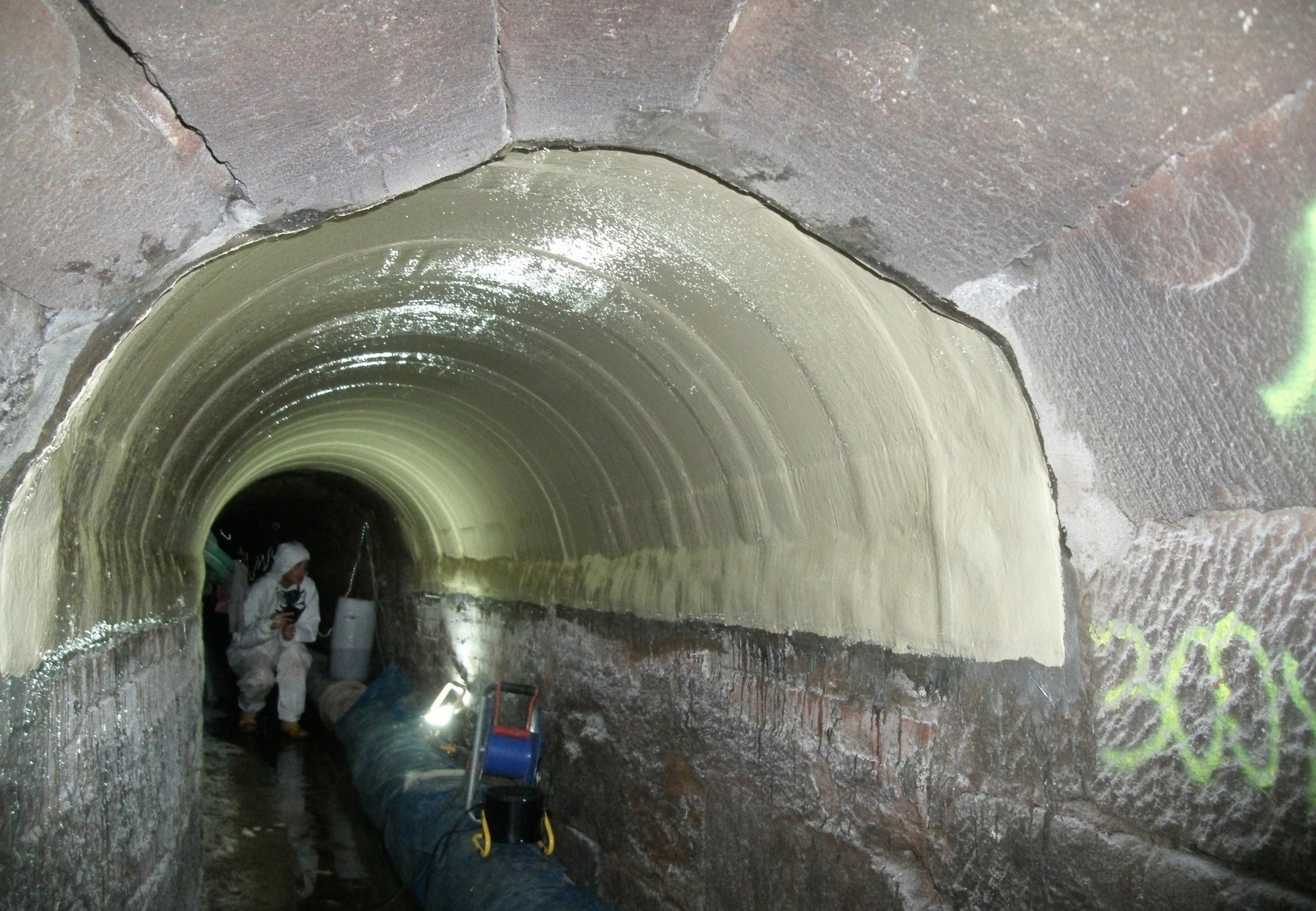Das Einbringen der GFK-Halbschalen in den Kanal erfolgte elementweise über die vorhandenen Zustiege. Im Einbaubereich der Schalen wurden die Wände zuvor mit hochsulfatbeständigen, mineralischen Mörteln reprofiliert, um eine geeignete Auflagerfläche für die GFK-Profile zu schaffen. Anschließend wurden die GFK-Halbschalen über Kopf auf die vorbereitete Kanalwandung aufgesetzt und angedübelt. Die Verbindung der einzelnen Halbschalen erfolgte durch die mechanische Verzahnung der GFK-Bauteile sowie durch ein zusätzliches Laminieren mit vor Ort härtendem Handlaminat. Auf diese Weise können selbst Bögen und Sonderformen saniert werden.