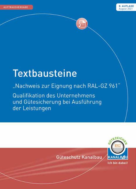 Die Infoschrift Textbausteine „Nachweis zur Eignung nach RAL-GZ 961“ – neben einer allgemeinen Ausgabe gibt es eine Ausgabe für Baden-Württemberg und Bayern – stellt dar, wie Auftraggeber in Deutschland die Gütesicherung Kanalbau RAL–GZ 961 wettbewerbs- neutral und fachgerecht als Nachweis der Bieterqualifikation im Vergabeverfahren und zur Sicherstellung der Gütesicherung im Zuge der Bauausführung bzw. bei der Abwicklung der Maßnahme in ihren Ausschreibungen verankern. „Beispielhaft wird anhand der einheitlichen Formulare aus dem Vergabehandbuch des Bundes für ein öffentliches Vergabeverfahren nach VOB/A Abschnitt 1 dargestellt, wie die Textbausteine in die Formulare fachgerecht eingepasst werden“, so Künster weiter.