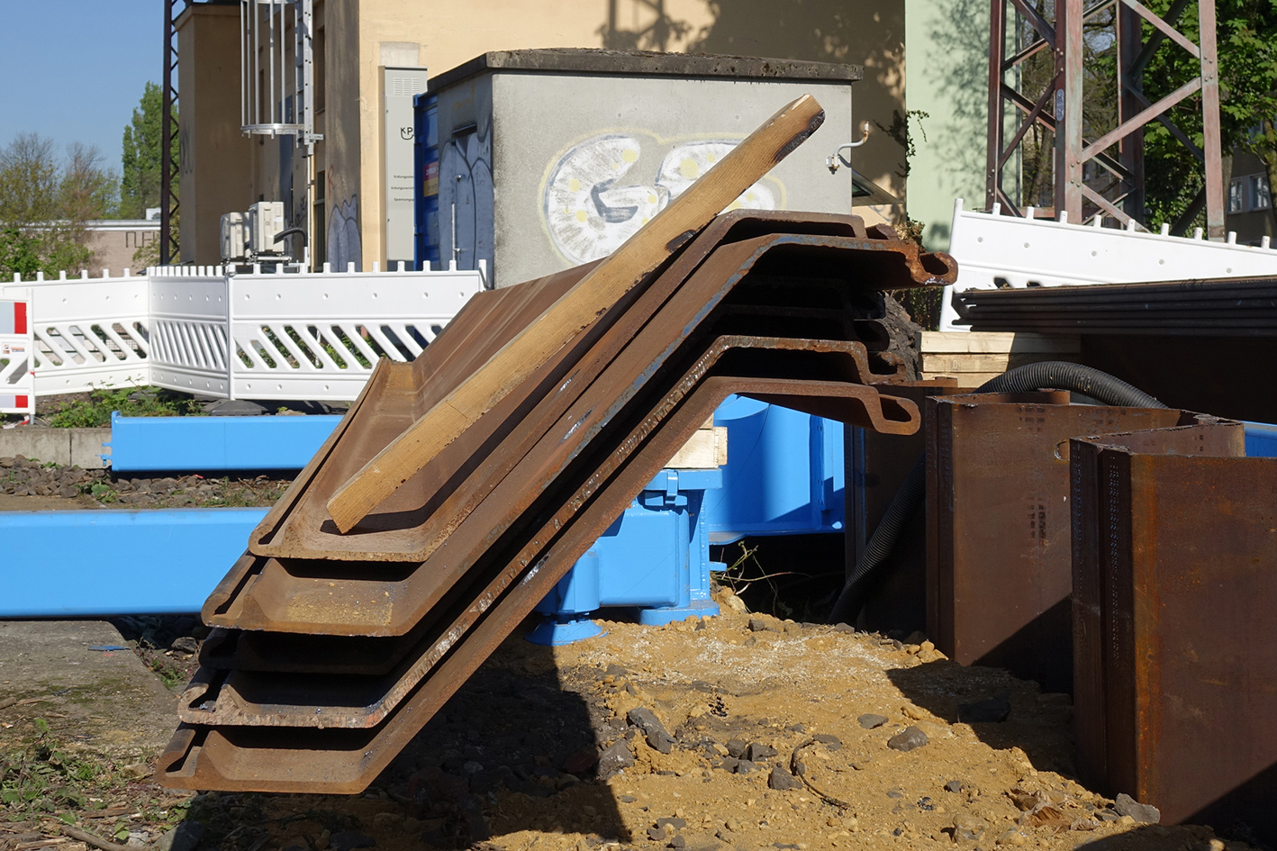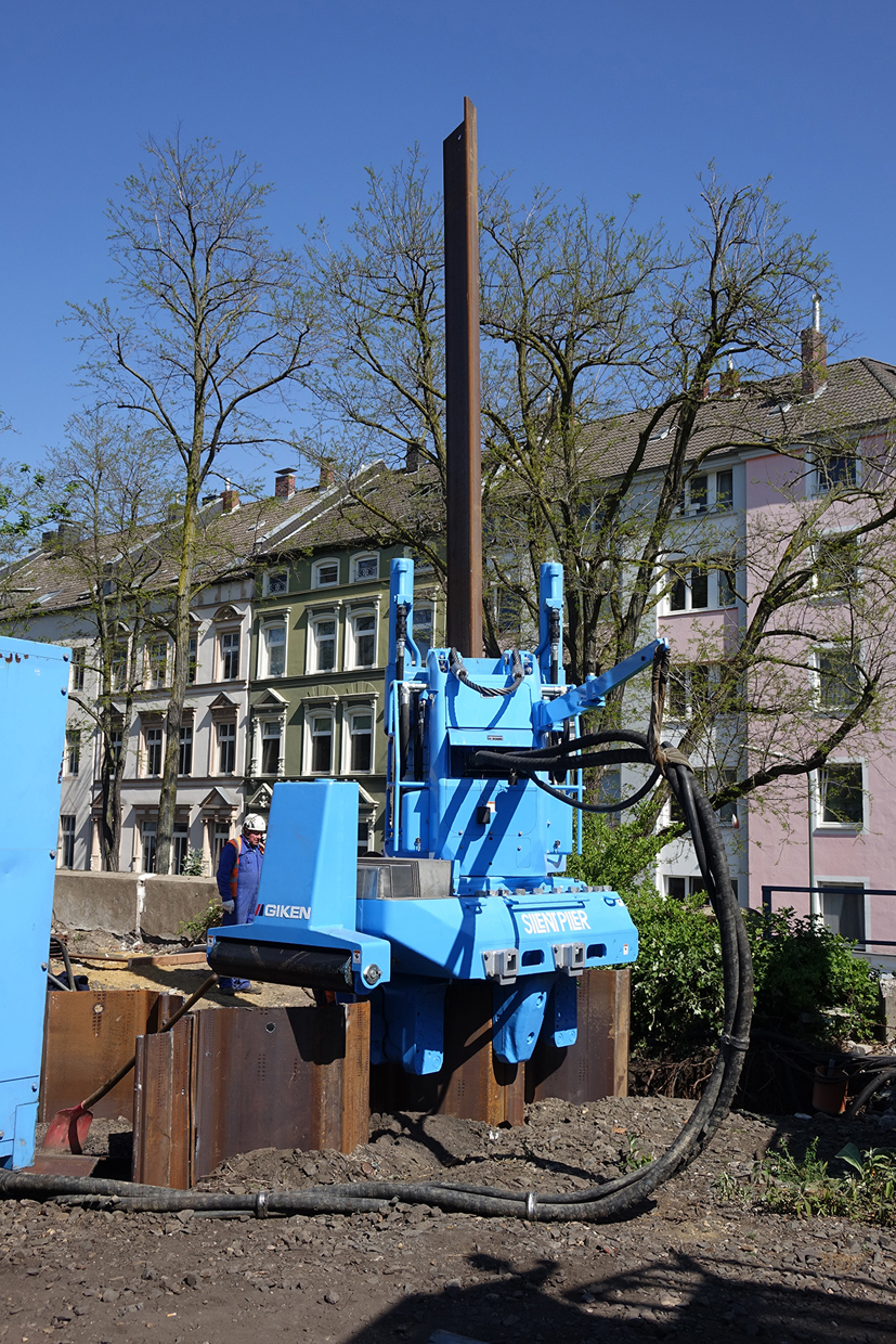 Das seien alles erschütterungssensible Bauwerke, sodass man ein Verfahren gesucht habe, was keine negativen Auswirkungen ausübte. So sei man auf den Silent Piler bei thyssenkrupp Infrastructure gestoßen. Dieser presse die Spundbohlen erschütterungsfrei in den Baugrund.