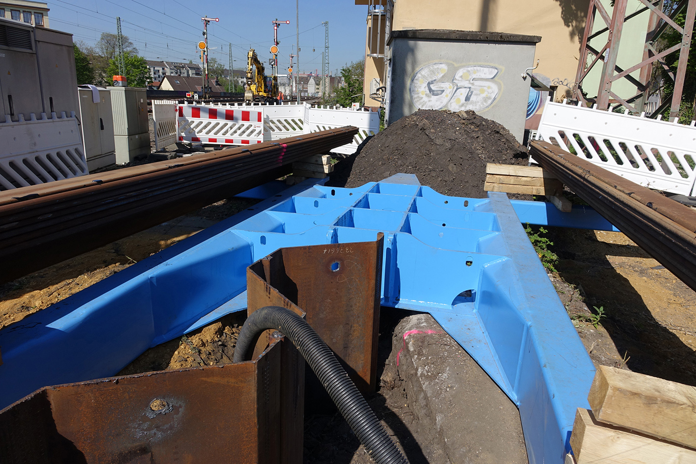Bei einem dieser Becken hatten sich die Planer von TGH mit verschiedenen Zwangspunkten auseinanderzusetzen, die ein herkömmliches Einrammen oder -vibrieren der Baugrubensicherung unmöglich gemacht haben, wie Dipl.-Ing. Yunus Aydin, Bauleiter bei TGH erläutert: „Nördlich des Beckens befindet sich eine Schwerlastmauer und östlich liegt in unmittelbarer Nähe eine Unterführung. Westlich steht ein Oberleitungsmast und südlich ein GSM-R Funkmast der Deutschen Bahn. Dort verlaufen auch die Gleise der Bahnstrecke.“