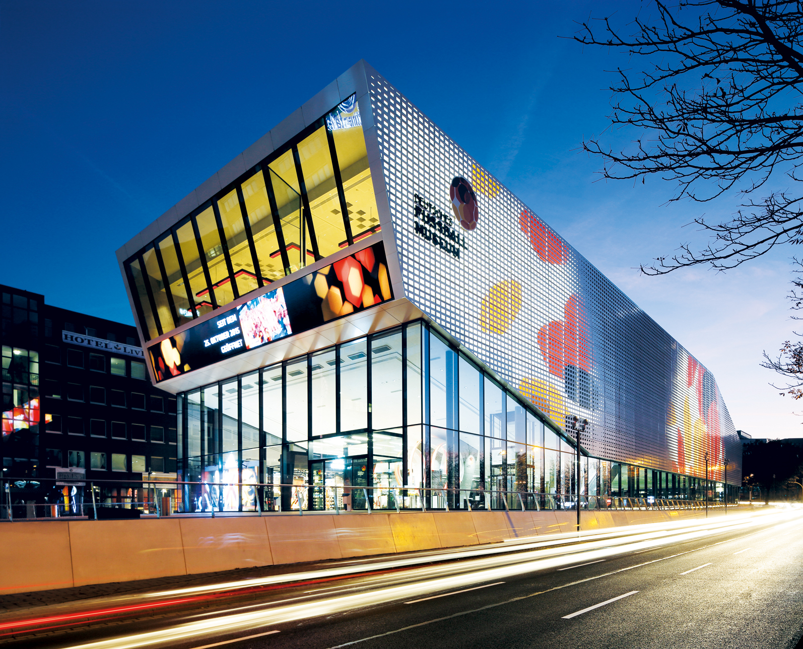 Die Architektur des Museums schließt auch die umgebenden Freiflächen ein. Der Einsatz von Lichteffekten zieht schon von weitem die Aufmerksamkeit auf das Gebäude. Eine 60 Quadratmeter große LED-Wand stimmt Gäste auf den Besuch ein. Zwischen überlebensgroßen Statuen von Fußballspielern und einer Rasenfläche in Spielfeldoptik führt außerdem ein System aus Leuchtstreifen über den Vorplatz in Richtung Eingang. Das architektonische Gesamtkonzept der Architekten von HPP Hentrich-Petschnigg & Partner stellte schon im Vorfeld hohe Ansprüche an die einzelnen Komponenten, so auch an die verbaute Entwässerungstechnik.