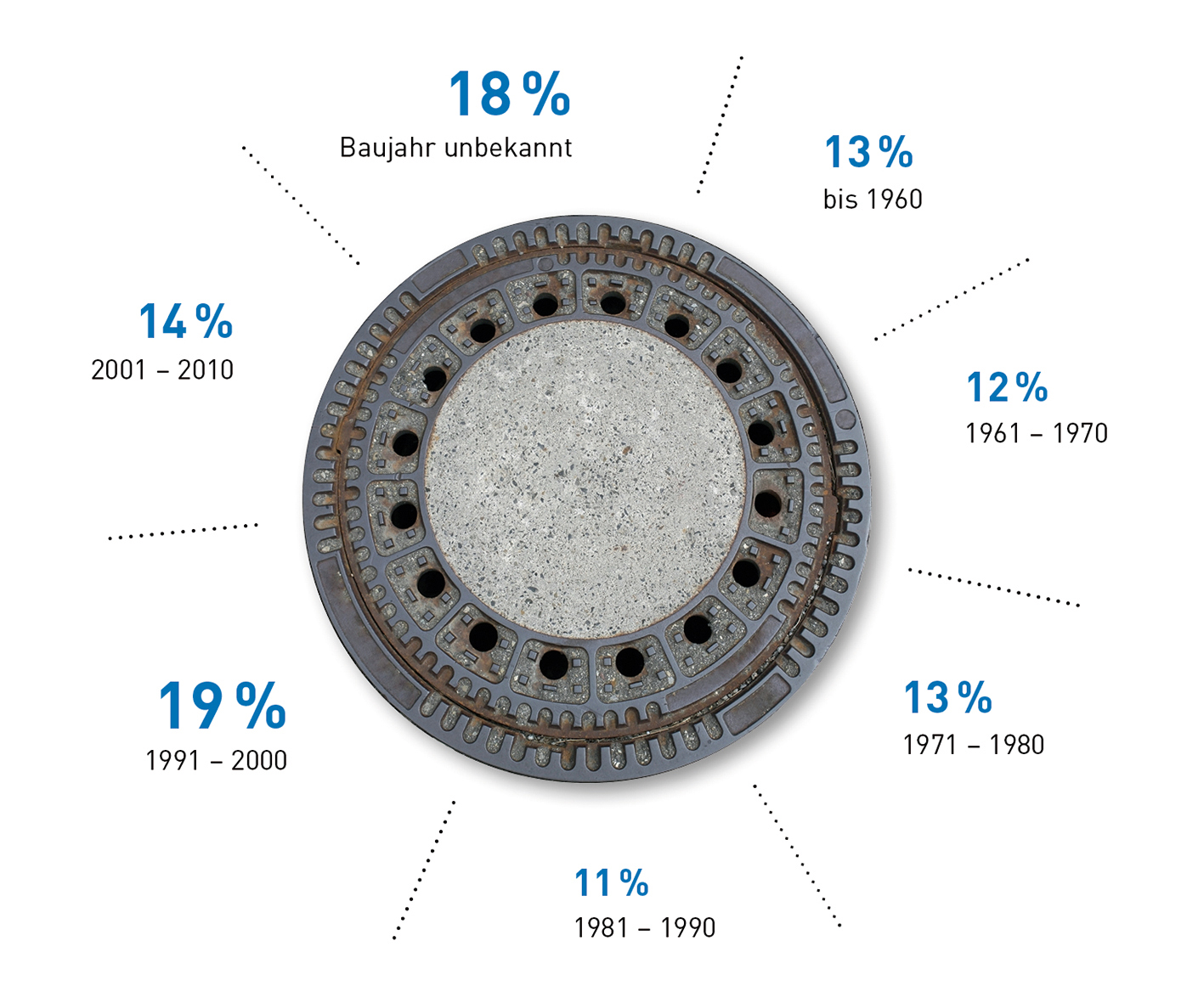 Erkenntnisse des Statistischen Bundesamtes zeigen folgende Altersstruktur des Kanalnetzes in Deutschland 2010: 14 % des Kanalnetzes waren nicht älter als 10 Jahre, 19 % zwischen 10 und 20 Jahre alt. 11 % waren zwischen 20 und 30 Jahre alt, 13 % 30 bis 40 Jahre alt. Zwischen 40 und 50 Jahre alt waren 12 %, weitere 13 % waren älter als 50 Jahre. 18 % des Kanalnetzes konnten altersmäßig nicht bestimmt werden.