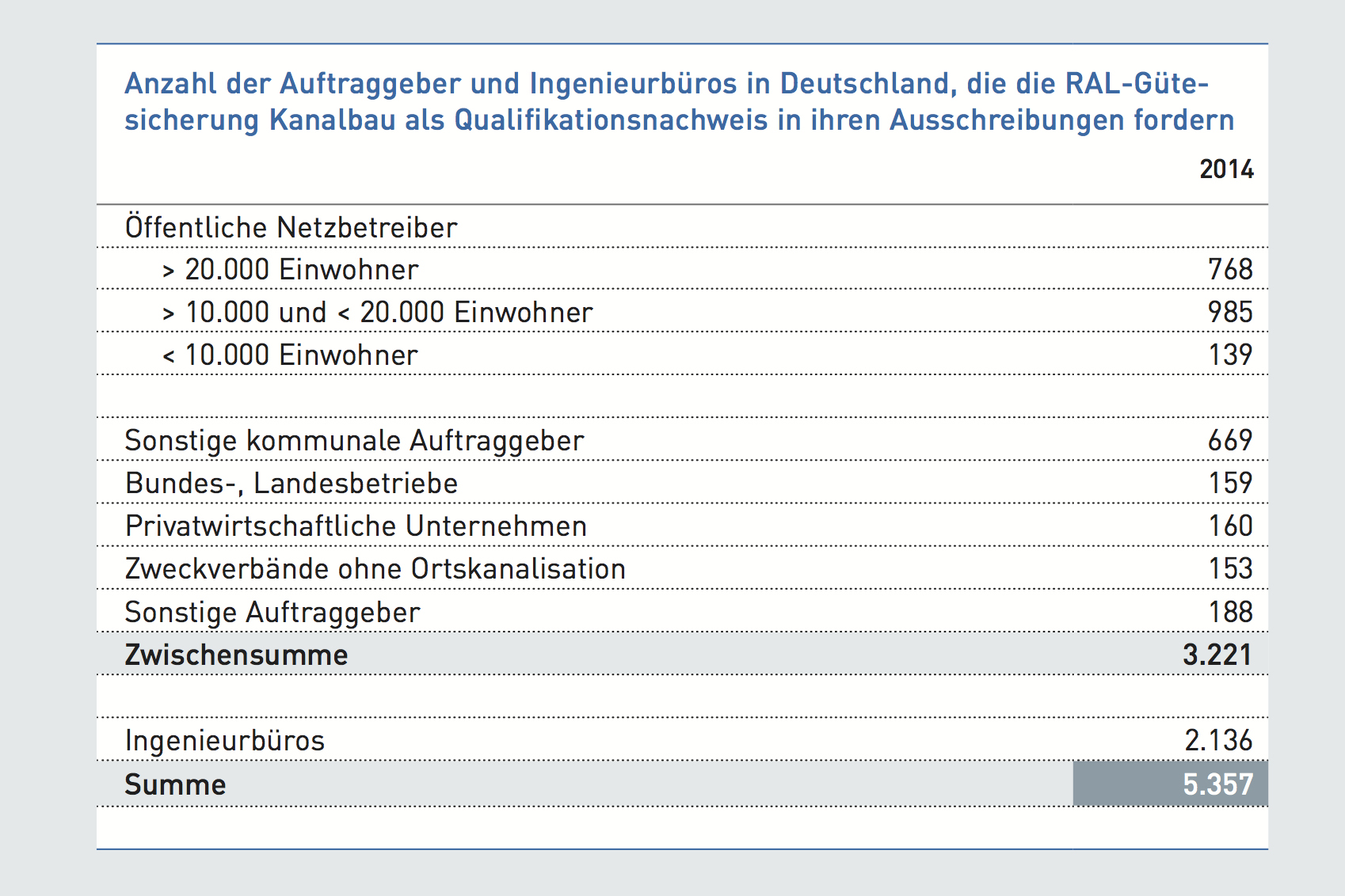 Voraussetzung für eine hohe Ausführungsqualität ist die Vergabe von Aufträgen zur Sanierung von Abwasserleitungen und -kanälen an fachlich geeignete Unternehmen. Hier bietet sich den Auftraggebern mit der Gütesicherung Kanalbau RAL-GZ 961 eine unabhängige Eignungsprüfung von Bietern. Diese weisen mit Erfüllung der Anforderungen der Güte- und Prüfbestimmungen RAL-GZ 961 ihre fachtechnische Qualifikation (Fachkunde, technische Leistungsfähigkeit und vertragliche Zuverlässigkeit) im Sinne § 6 (3) der VOB/A nach. Durch die Vergabe von Aufträgen ausschließlich an geeignete Firmen werden Kommunen bzw. Abwasserbeseitigungsunternehmen ihrer haushaltsrechtlichen Verantwortung gerecht, entsprechend dem Slogan: Qualität fordern – Werte schaffen.