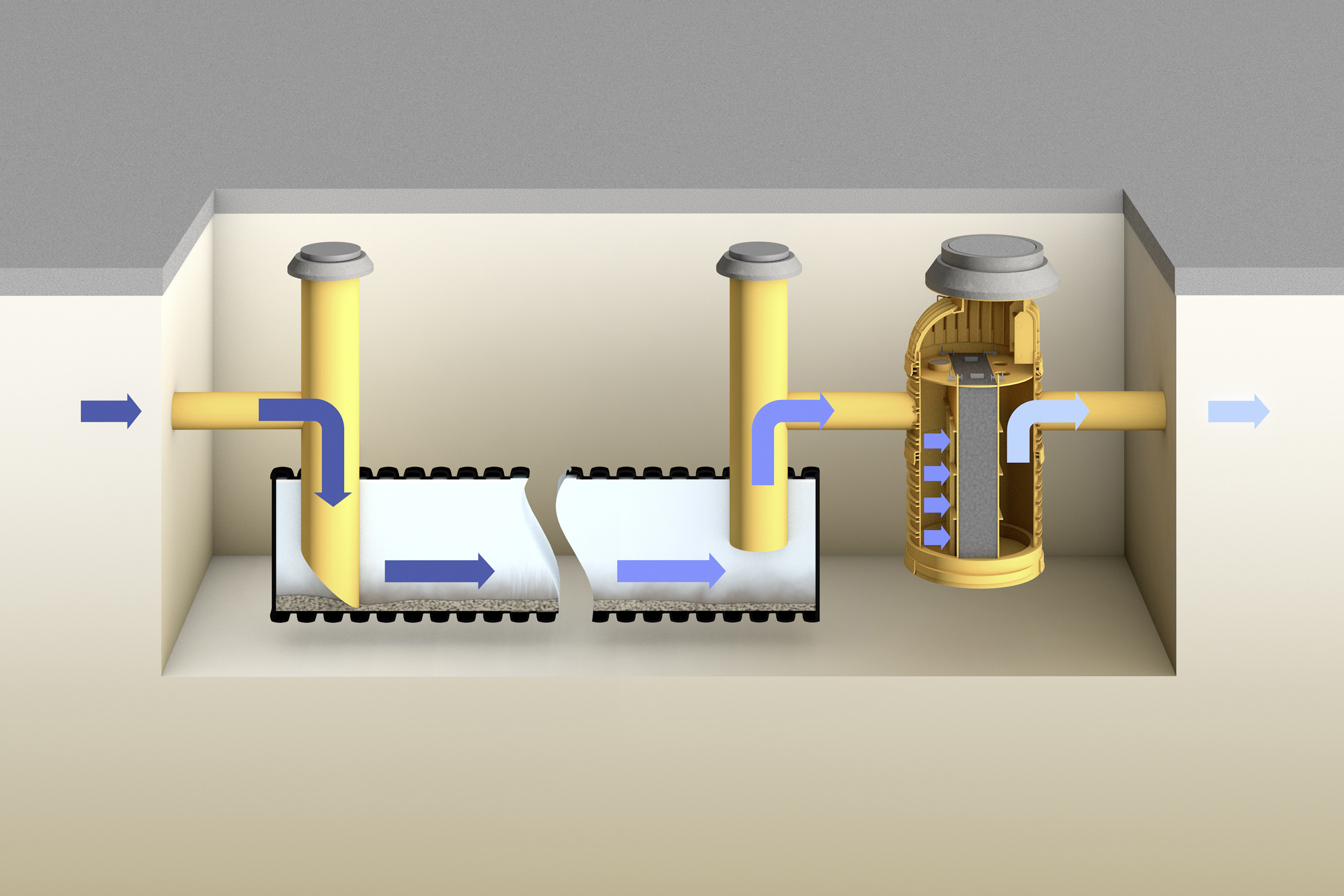 Aufgrund baulicher Gegebenheiten konnte das Niederschlagswasser des Grundstücks nicht in das öffentliche Kanalnetz eingeleitet werden. Auch eine großflächige Versickerung über Mulden oder Gräben schied wegen der beengten Platzverhältnisse und der eingeschränkten Versickerungseignung des anstehenden Bodens aus. Für eine unterirdische Versickerung des Regenwassers war es aus Gründen des Boden- und Grundwasserschutzes erforderlich, das von den Park- und Verkehrsflächen abfließende Niederschlagswasser vorab einer geeigneten Behandlung zuzuführen. Hierbei galt es, die Vorgaben der Bundesbodenschutzverordnung einzuhalten und sowohl die im abfließenden Wasser enthaltenen Feststoffe (Reifen-, Bremsenabrieb) und Leichtflüssigkeiten (Benzin, Tropföl) als auch die gelösten Schwermetalle (Kupfer, Zink) weitestgehend zu entfernen.