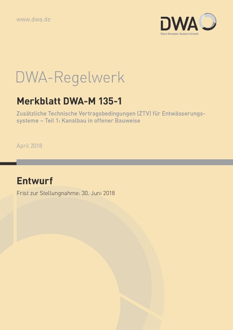 Die Deutsche Vereinigung für Wasserwirtschaft, Abwasser und Abfall e. V. (DWA) hat den Entwurf zum Merkblatt DWA-M 135-1 „Zusätzliche Technische Vertragsbedingungen (ZTV) für Entwässerungssysteme – Teil 1: Kanalbau in offener Bauweise“ vorgelegt, der hiermit zur öffentlichen Diskussion gestellt wird.