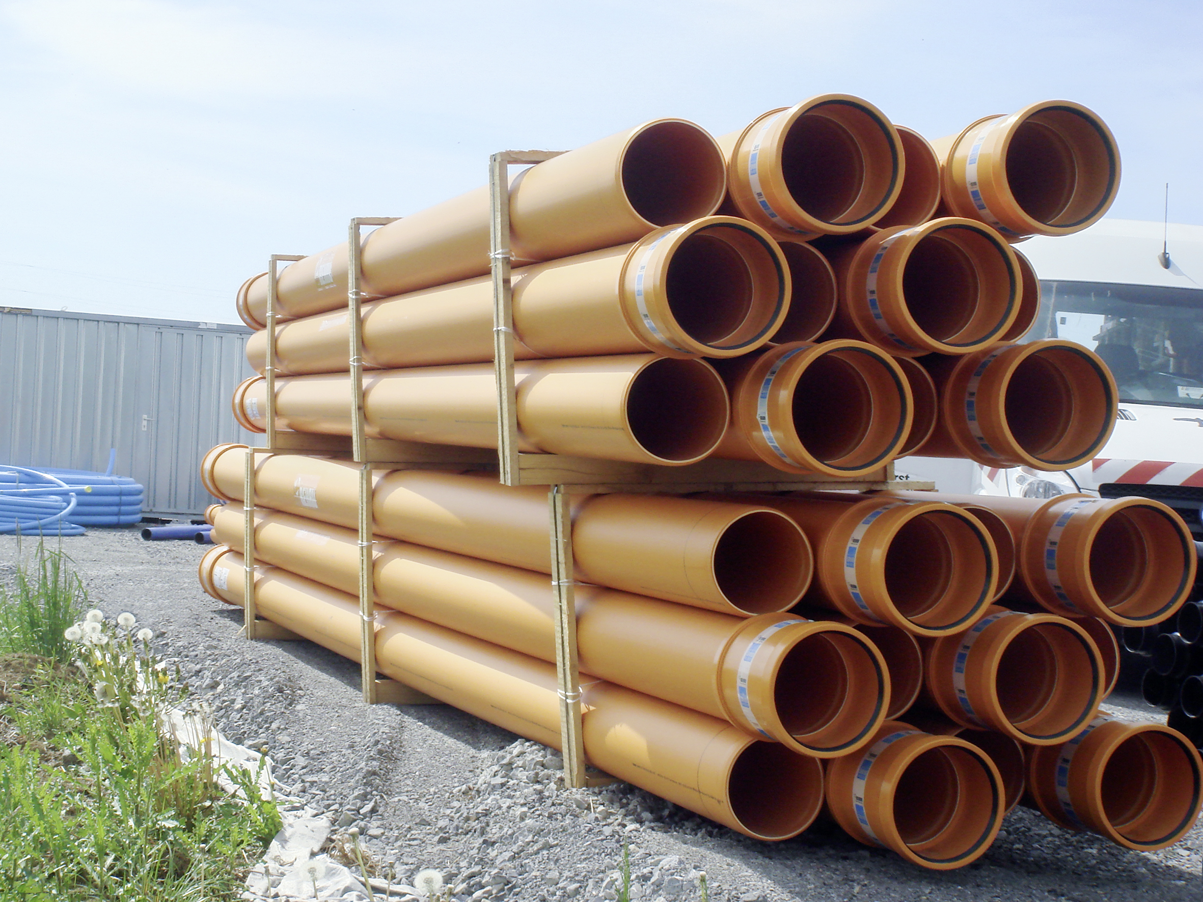 Ein klares Argument für die Verlegung von AWADUKT PP Rohren und Formteilen lieferte dabei der füllstofffreie und dadurch äußerst robuste und äußerst zähe Werkstoff Polypropylen. Zum einen weist das Material eine mehr als 40fach höhere Schlagfestigkeit gegenüber Steinzeugrohren auf (Quelle: MFPA Weimar, 2003, Bericht B45/454/03) und bietet so größtmögliche Verlege- und Betriebssicherheit. Zum anderen lassen sich die Kunststoffrohre dank ihres geringen Gewichts beispielsweise gegenüber Betonrohren um bis zu 30 Prozent schneller verlegen (Quelle: Verlegezeiten entnommen von TEPPFA, 2013, Sewer Installation Time – Plastics versus Concrete).