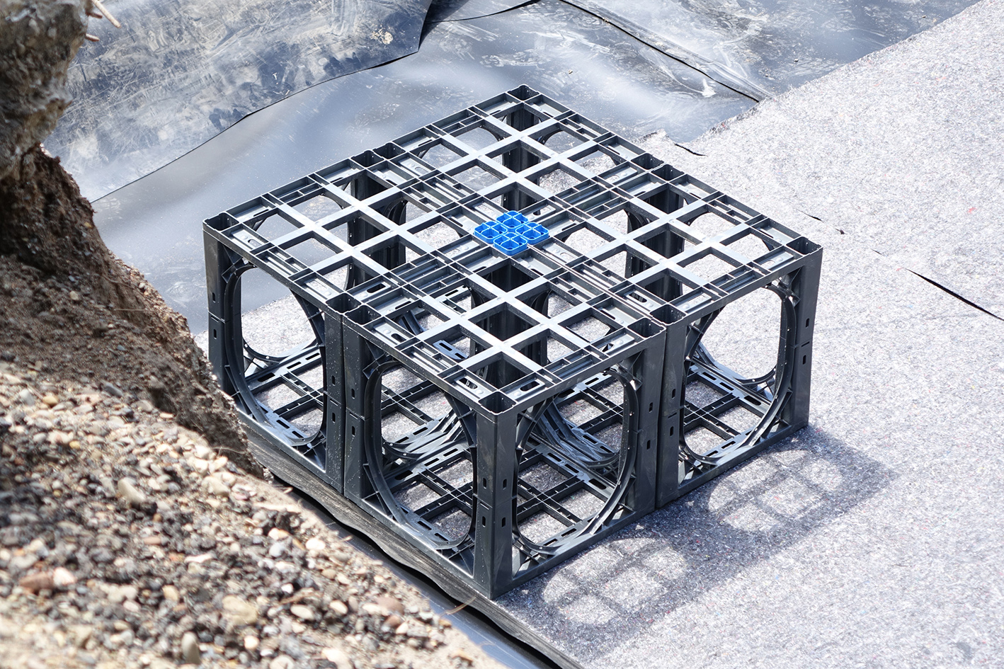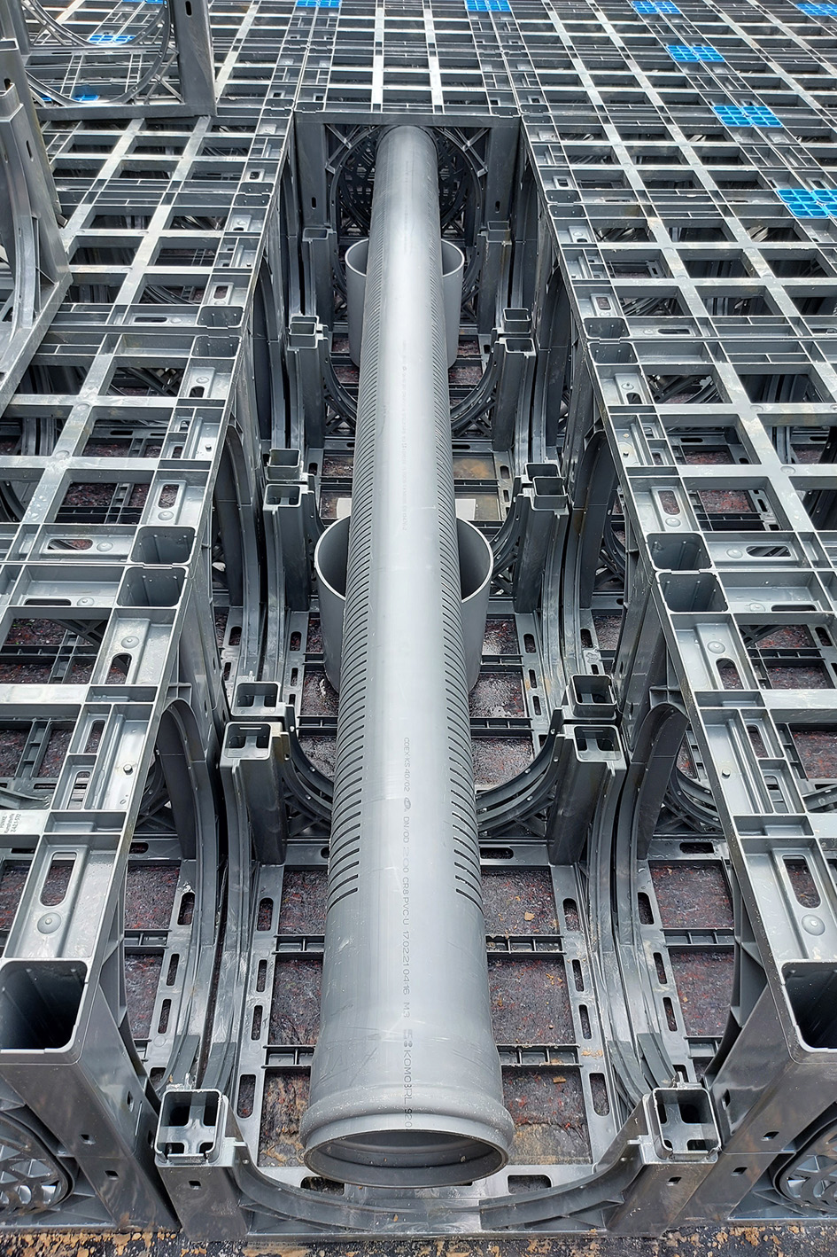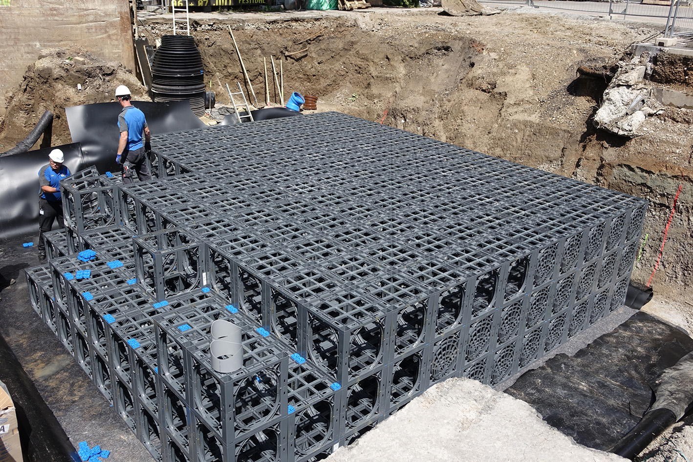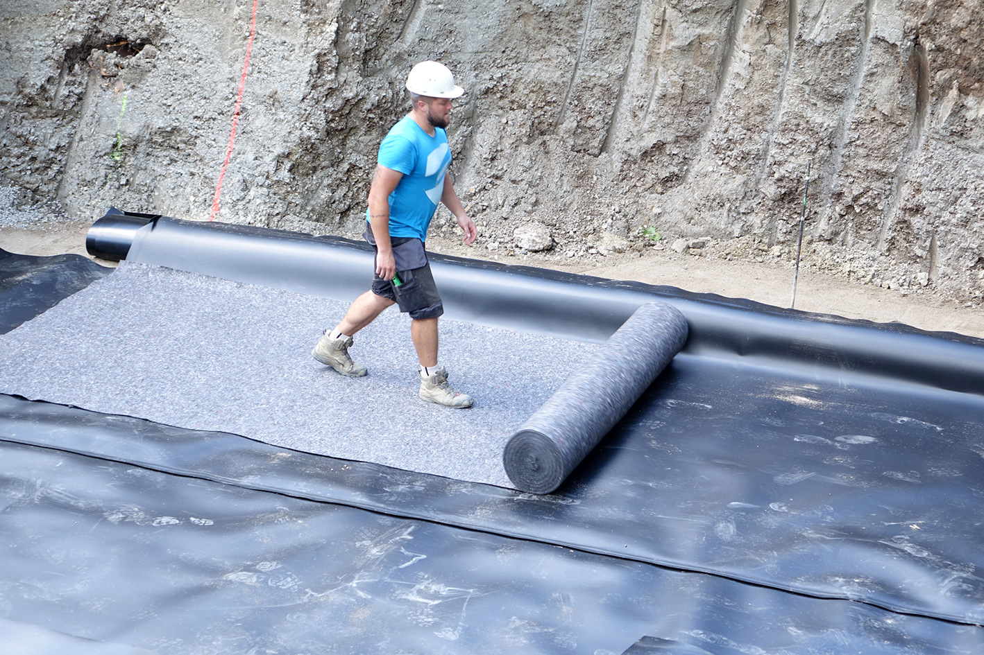 Hierfür legten die Arbeiter zunächst die erste Lage Filtervlies auf dem vorbereiteten Planum aus. Hierauf wurde die zwei Millimeter starke KDB verlegt und die einzelnen Bahnen verschweißt, bevor diese mit einer weiteren Lage Vliesstoff abgedeckt wurde. Auf diesen Schichten wurden die D-Raintank 3000®-Elemente dreilagig mit Verbindern verlegt und der fertige Retentionsraum mit Vlies, KDB und Vlies ummantelt, wobei die KDB wiederum zunächst verschweißt wurde.