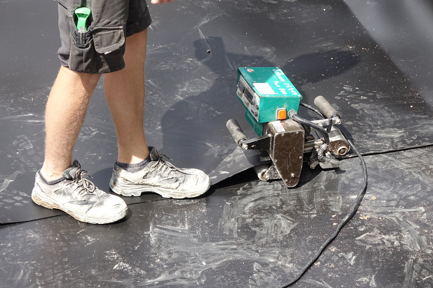 Eigentlich ist die Rohrleitungs-, Straßen- und Tiefbau GmbH (RST) aus Bovenden mit Arbeiten rund um die Stadthalle betraut. Für das Verschweißen der Folie der D-Raintanks 3000® bedarf es jedoch einer besonderen Qualifikation nach der DVS-Richtlinie 2212-1 (Prüfung von Kunststoffschweißern – Prüfgruppen I und II). Hier vermittelte Funke kurzerhand an eine Fachfirma, die über die entsprechende Zertifizierung verfügt. Um den Retentionsraum zum einen gegen Bodeneintrag abzudichten und zum anderen vor Beschädigungen zu schützen, wurden die Elemente mit einer Lage Filtervlies, einer verschweißten Kunststoffdichtungsbahn (KDB) und einem weiteren Filtervlies ummantelt.