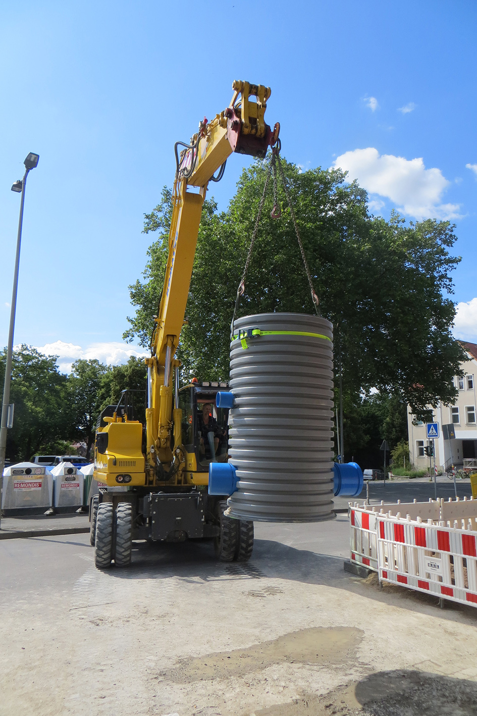 In der Vergangenheit hatte das Büro bei anderen Baustellen bereits gute Erfahrungen mit Produkten von Funke Kunststoffe gesammelt. Daher setzte man auch mit Blick auf die Göttinger Stadthalle auf die durchdachten Systemlösungen des Herstellers mit Sitz im westfälischen Hamm: Zum Einsatz kamen HS®-Kanalrohre, eine Sedimentationsanlage, ein Entnahmeschacht, ein Drosselschacht sowie ein unterirdischer Retentionsraum mit L/B/H 7,20 x 7,20 x 1,80 m. Letzterer besteht aus insgesamt 432 D-Raintank 3000®-Elementen und wurde dreilagig eingebaut und mit einer Kunststoffdichtungsbahn (KDB) aus PE-HD wasserdicht verschweißt. Damit konnte vor der Stadthalle in Göttingen ein unterirdisches Regenauffangvolumen von rund 93 m³ geschaffen werden.