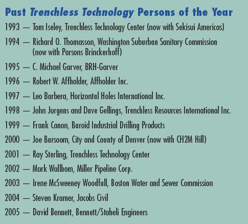 What makes Bruce such a good leader in the industry is his willingness to put his service to industry above himself, says Mark Wallbom, senior vice president of Miller Pipeline and a former Trenchless Technology Person of the Year winner. Bruce succeeded Wallbom as NASTT chairman in 2005.