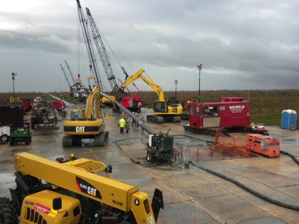 Serving as project manager for Chevron, Ralph Radomski oversaw the drilling, pipe stringing and marine operations conducted by the team of contractors. To support Michels’ drilling operations, Chevron hired a local contractor, Sunland, who are familiar with directional drilling procedures and have extensive experience in local marine construction. Sunland performed pipe string-out and welding operations for both crossings, and also provided marine support for the HDD operations. This included barging Michels’ resources to the exit sides and excavating a temporary false ditch for floating the pipe through a marsh area before finding suitable water to float the remaining section.