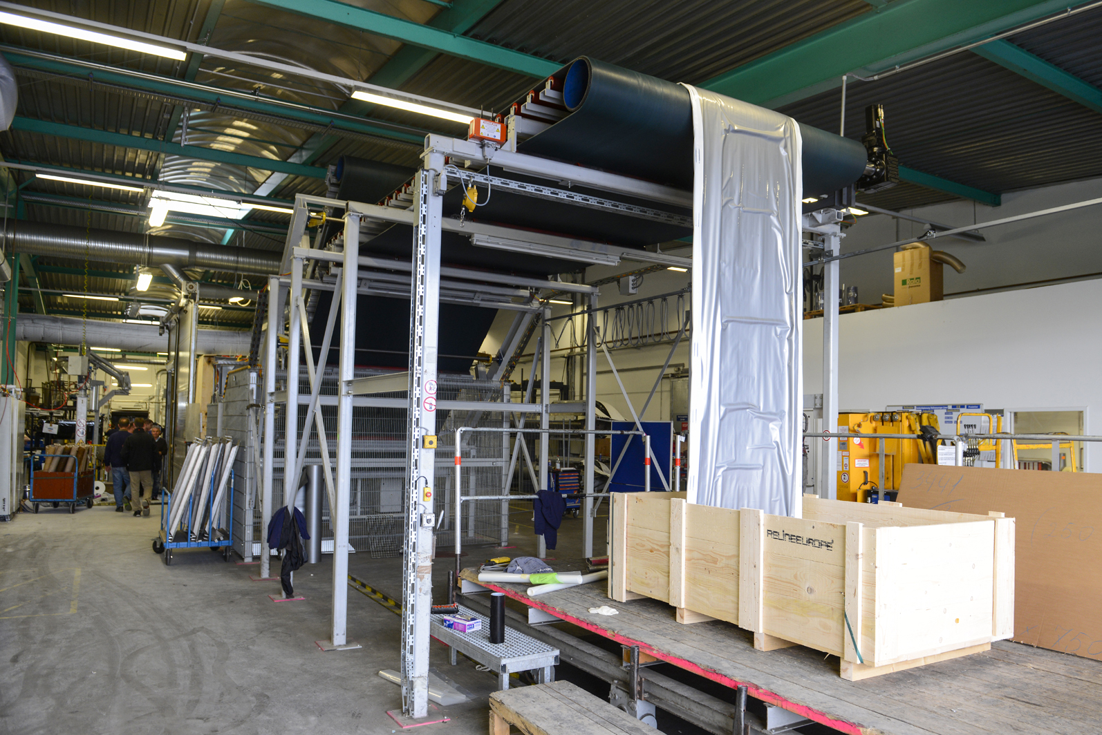 The Alphaliner production line for large diameters has been in service in Rohrbach since the end of January. This machine now makes it possible to produce the first test phase of GFK hose liners up to a diameter of DN 1500. The foundations of the machine hall had to be reinforced due to the weight of these large-profile liners. The machine has been designed to make it possible to subsequently extend it to linear diameters up to DN 1800.
