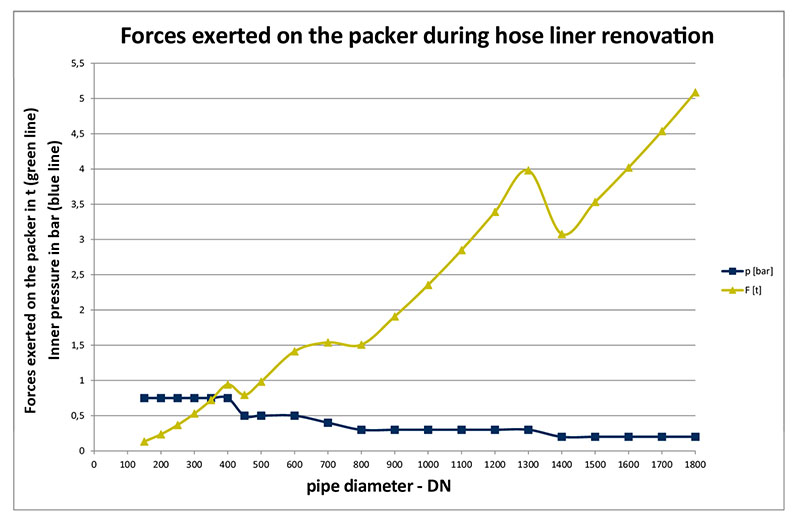 The challenges involved in large diameter renovations are demonstrated even by the apparently minor matter of installing the packer. The installation of large diameter pipes imposes enormous forces on the packer. For example, the force on the end packer for a DN 800 hose liner is about 1.5 tons, while the load imposed on the component during the installation of a DN 1500 is more than double – at 3.5 tons. Securing the packer with simple tension straps, timber wedges or jack screws will hardly be adequate to absorb the enormous forces involved. Health and safety considerations alone are therefore reason enough to consider, and even more importantly to plan safety measures of a whole different order.