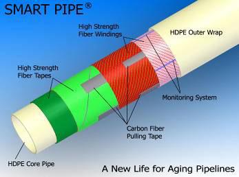 2. OVERVIEW OF THE CONCEPT Smart Pipe® is a continuously manufactured, high strength, light weight, highly durable, selfmonitoring, composite of thermoplastic materials. While this technology can be used either as a stand alone pipe or as a tight fitting internal liner to rehabilitate an existing steel pipe, its use in the form of a liner for degraded steel energy transmission pipelines is highlighted in this paper. While other component materials can be used to meet special conditions, in its standard form the liner is composed of a high density polyethylene (HDPE) core that is wrapped contra helically with fabrics consisting of unidirectional E-Glass fibers for lower pressure applications or with Kevlar fibers for higher pressures. The strength layer is overlaid by fiber optic sensor cables and axial direction high strength carbon tapes, with high strength tows (fiber bundles) securing them; with the whole being covered by a waterproof, protective outer coating. In essence, the contra helically wrapped fabrics act as the primary pressure induced hoop load reinforcement, while the longitudinal carbon tapes enable the liner to be pulled in continuously over very long distances and provide supplemental reinforcement for axial direction stresses during service.