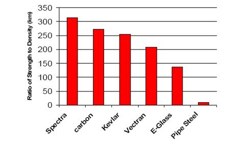 The basic reason for the performance that is expected from a rehabilitation of a pipeline with a Smart Pipe® liner – both for long continuous pull-ins and very high pressure capabilities after the installation of a liner – is the extraordinary mechanical properties of the fibers that are used in the contra helical wraps and in the longitudinal pull-in tapes. Their elastic moduli are roughly comparable to line pipe steel. However, they generally have much higher strengths and significantly lower densities. Because the primary consideration for a Smart Pipe® application is a fabric that is both light and strong, the key selection criterion is the strength to weight ratio; NB, this ratio has the units of length. The comparison of this ratio of mechanical properties for each of the several leading candidates with line pipe steel that is provided in Figure 3 clearly shows the superiority of the ultra high strength fibers. Of course, there are also other features (e.g., cost, availability, handling ability, critical strain) that also influence the choice.