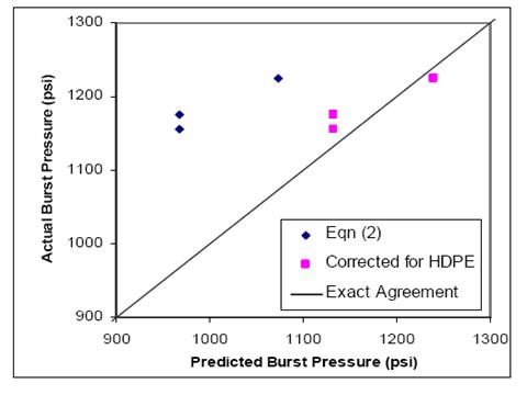 It can be seen in Figure 5 that Eqn (2) consistently provides an under estimate of the actual burst pressure; e.g., about 15% in this particular instance. To be assured that this underestimation is actually due to the neglect of the HDPE core pipe, nonlinear calculations were made in which, by an iterative process, the contribution of the HDPE could be included. Figure 5 shows that these results are in quite good agreement with the measurements. It should be noted that for higher design pressures and larger diameters, the relative contribution of the core pipe to the strength will become very small, in which case Eqn (2) will be fully adequate for most design work.