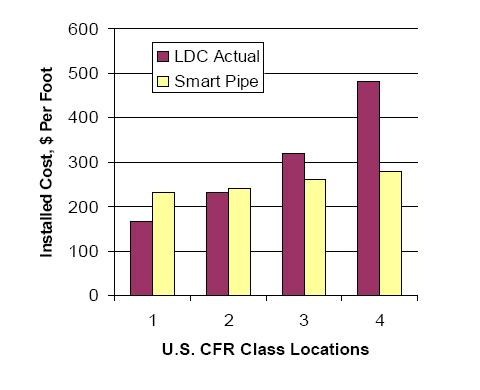 Another feature that can contribute to significantly lower lifetime costs is the fiber optic sensor system that can detect and pinpoint mechanical impacts, ground movements and other anomalies. In natural gas pipelines, leaks can be readily and instantaneously detected. Additionally, because there is no ceiling on the pressure capacity that can be designed into Smart Pipe®, its use can permit a system to be upgraded to higher pressures, from which the greater through put could make the rehabilitation pay for itself.