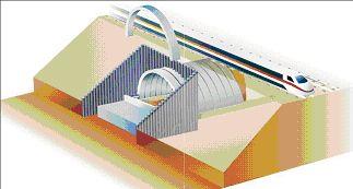 The jacked arch and jacked deck technologies have a capability of installing underground stations. The graphic of a station is based on driving in both directions from a central excavation which would form the access concourse. The length of the station is determined by platform length required to accommodate the number of carriages. A platform length of 140m is shown which will accommodate up to 8 carriages. Longer lengths would be possible. Current dimensions for spans and lengths for stations can easily be accommodated. The jacked arch and deck alternative graphics are based on a 12m width between platforms which would accommodate twin tracks with wider trains than the London underground.