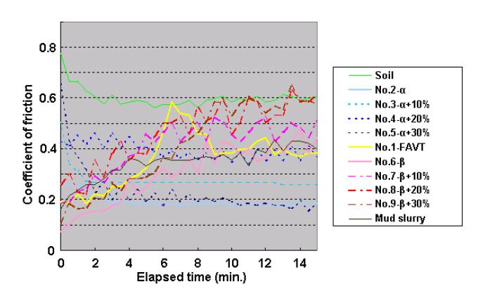 Table 4: The composition of mud slurry. (Source: Shimada et al.) Figure 5 shows the relationship between the elapsed time after starting the test and the coefficient of friction for all samples. It is understood that the coefficient of friction is about 0.6 when the lubricant into the over-cutting area is disappeared and the concrete pipe comes into contact with the surrounding soil directly. The coefficient of friction of only Lubricant α and Lubricant α added 20% mud slurry were lowest and maintained during the test. Since Lubricant α has a gelatinous solid texture, it has strength against the weight of the upper part of container. So, no failure or seepage into the concrete occurred. Conversely, the coefficient of friction of only mud slurry and Lubricant β were increased as time elapsed after starting the test. This is the reason why the mud slurry and Lubricant β easily permeated into the soil. Moreover, the added percentage of mud slurry in Lubricant β was increased, and the coefficient of force was also increased. From this point, it is understood that Lubricant β is inferior as a lubricant for the over-cutting area.