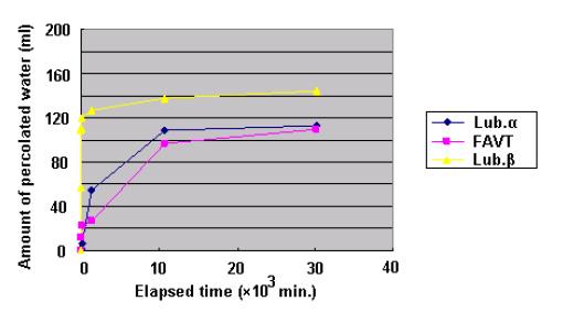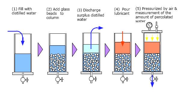 Figure 6 shows the pressurized seepage test procedures. An acrylic column 75mm in diameter and 300mm in length was prepared. After this column was filed with distilled water, glass beads with a diameter of 1mm were thrown into the column to a depth of about 150mm. Then, the surplus distilled water displaced by the glass beads was discharged. 250ml each of the flyash surface-active agent mixture, Lubricant α and β, were prepared, and poured into the glass bead layer immediately after mixing, and the pressurized seepage test was carried out 10 minutes after each lubricant was prepared. 0.5kPa of compressed air was applied to the lubricant, and the weight of percolated water from the glass bead layer and the dehydrated water from a lubricant was measured.