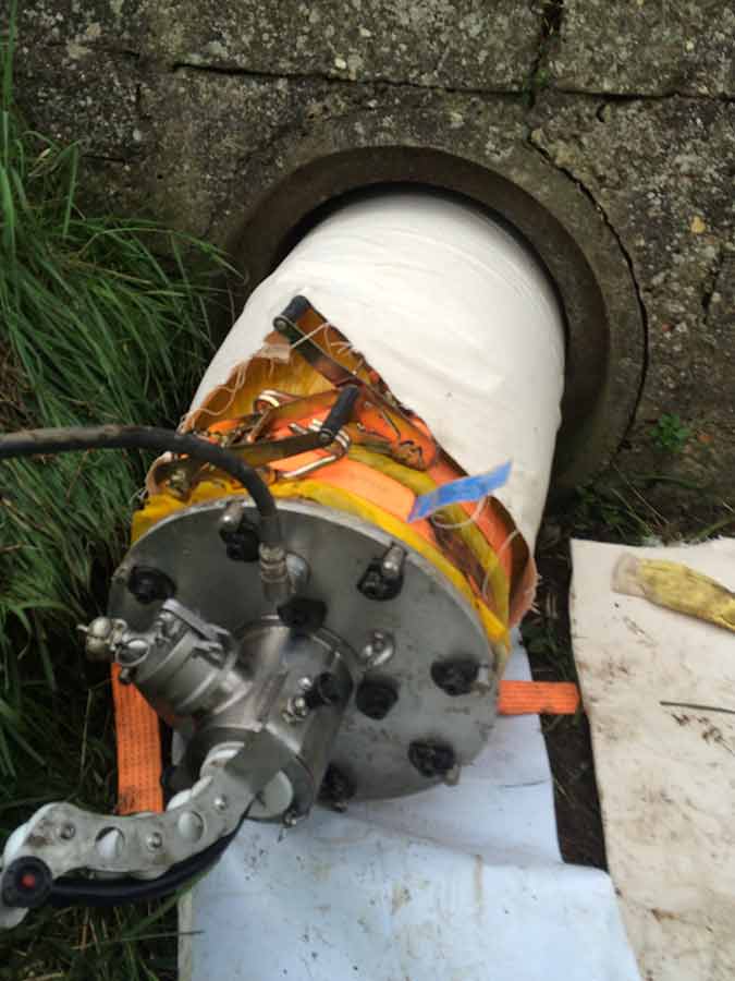 In the meantime the UV light train was set-up and connected to a towing line that ran through the liner. The light train was then placed into the liner, the ends were sealed using special fittings that allowed the light train to be pulled freely through the liner whilst maintaining it in its inflated state so as to achieve the curing process. The liner was then fully inflated against the inner culvert wall.