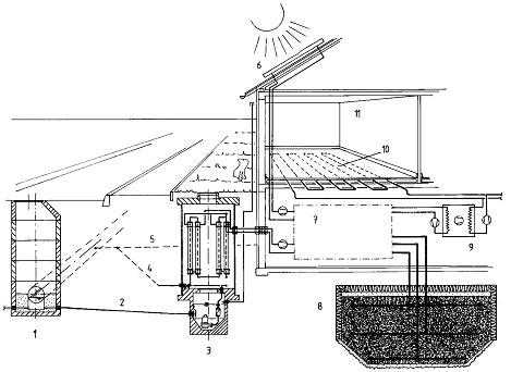 The installation is very simple. Before the building is erected, an appropriate large and special shaped pit has to be additionally dug up down from the building excavation bottom. The side walls of the pit have to be lined at least with a watertight foil and an appropriate insulation material. The bottom of the pit can be left without sealing, since the liquid bonding agent (cement mortar) penetrates into the peripheral area of the soil and seals the cellular concrete body against the surrounding ground (self-sealing-effect) after curing. The delivered or on-side mixed cellular concrete is poured into the pit and filled up nearly to the top while a heat pipe collector system is integrated and positioned in several horizontal levels.