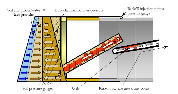 - a 1/10 scaled model for EPB excavation simulation was set up in the work of a National French Research Programme (AFTES, 2001). The model consisted of a 500mm diameter cutting head of 500 mm, a conical excavation chamber, a inclined screw conveyor, a horizontal screw conveyor, a cylindrical shield and four thrusting cylinders. The soil to be excavated was placed in a rigid 2 x 1.3 x 1.3 m box. A loading device, using ten air cushions, allowed the simulation of an additional overburden. The system was instrumented with several monitoring transducers for the driving parameters, the soil stresses and deformation control (Branque et al., 2003);