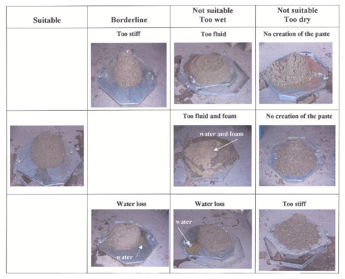- too stiff behaviour or impossibility to create a plastic “paste” ,due to insufficient water or foam content: an irregular collapse of the cone can be observed;