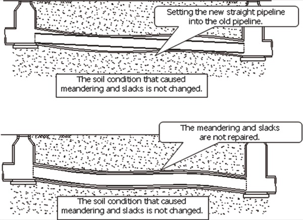 Current renewal methods for pipelines and culverts are very effective for pipe function decline and accident prevention, but offer little in the way of rehabilitating meandering and slacks of pipes. Continually expanding urbanisation means that restoring pipeline position using open cut methods has become less desirable, and as such has led to the development of new pipeline position restoration technologies, such as the chemical injection method.