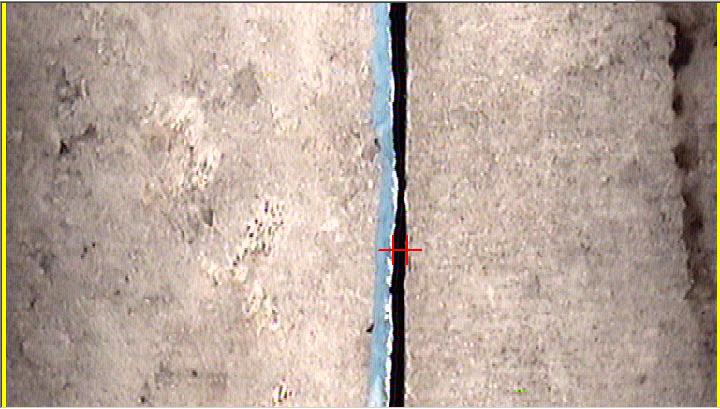 As it is too small the width of the longitudinal crack in the crown area of the sewer, on the other hand, not be gripped and determined with the reticules (only the reticules’ line width is far greater in this case). Fig. 8 c chosen view of the fold-out after activating the 4x digital zoom, which already shows a high level of graining with this zoom factor. Correspondingly, with both reticules the actual crack width cannot be defined exactly. In this picture, which allows a positioning of the reticules in this enlarged version, the crack width was calculated with 3.68 mm; a value, which in the face of this crack characteristic appears too high for the experienced observer in the perspective view.