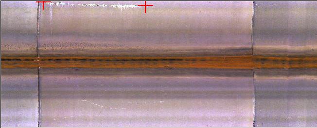 Figure 7 gives a detailed view of a pipe joint in a concrete sewer DN/ID 500, which was recorded by the special hybrid camera function "socket radial scan" and is presented in the viewer in the menu option "radial scan" (cf. also Fig. 5) as a fold-out. By means of the measuring function on the fold-out a manual measuring was carried out via reticules. In this way the socket statistics, which are created during the "socket radial scan" and which are shown in Figure 5, should be analyzed in order to gain information on the width of the pipe joint and/or the joint gap as well as the condition of the pipe joint as regards defects, leakage, etc.