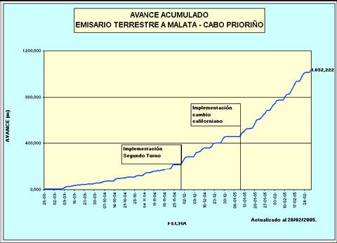 To date of 28/02/2005, there are 1.032,222 meters excavated, which represents the 14,06 % of the total of the tunnel.