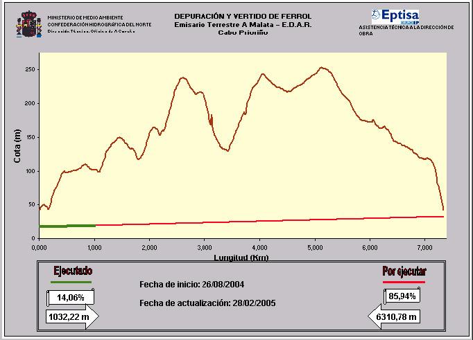 The project consists of the construction of a tunnel of 7.344 meters long, with an excavation diameter of 3,70 meters and an inside diameter of 3 meters long, with a slope of 1,86/1000 which will carry waste waters from the Pumping Station in La Malata towards the water treatment plant in the Prioriño Cape.