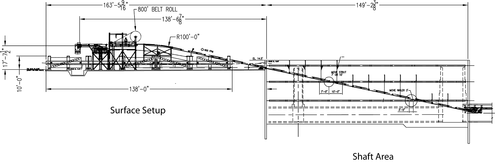 During TBM operation, an extensible fabricbelt conveyor (24" belt width) is constructed behind the TBM and over the top of the back-up system in the crown of the tunnel. The muck is discharged from the screw conveyor onto the conveyor at the front of the back-up system. From there, the conveyor system is elevated over top of the back-up system and into the crown of the tunnel. The belt structure is assembled in the installation window assembly which is mounted on top of a back-up deck, while the assembled belt structure comes out of the installation window as the TBM advances forward. A tripper assembly is located at the open cut in the tunnel and redirects the conveyor up thru the open cut at a 12 degree incline. The extensible conveyor is equipped with a 1,150ft capacity belt cassette with a 150HP hydraulic power unit and a splicing stand, which allows conveyor belting to be added to the system. The conveyor system is powered by a 200HP Main Drive, which discharges onto the stacking conveyor. Two 200HP carrying booster drives are added into the system as the conveyor advances, and are mounted in the crown of the tunnel by using an integrated drive support frame. The frame is designed with adjustable length legs that mount to the tunnel wall at designated distances in the tunnel. The conveyor is designed for a total length of 19,498 ft at 250 USTPH while running the conveyor at 600 FPM.