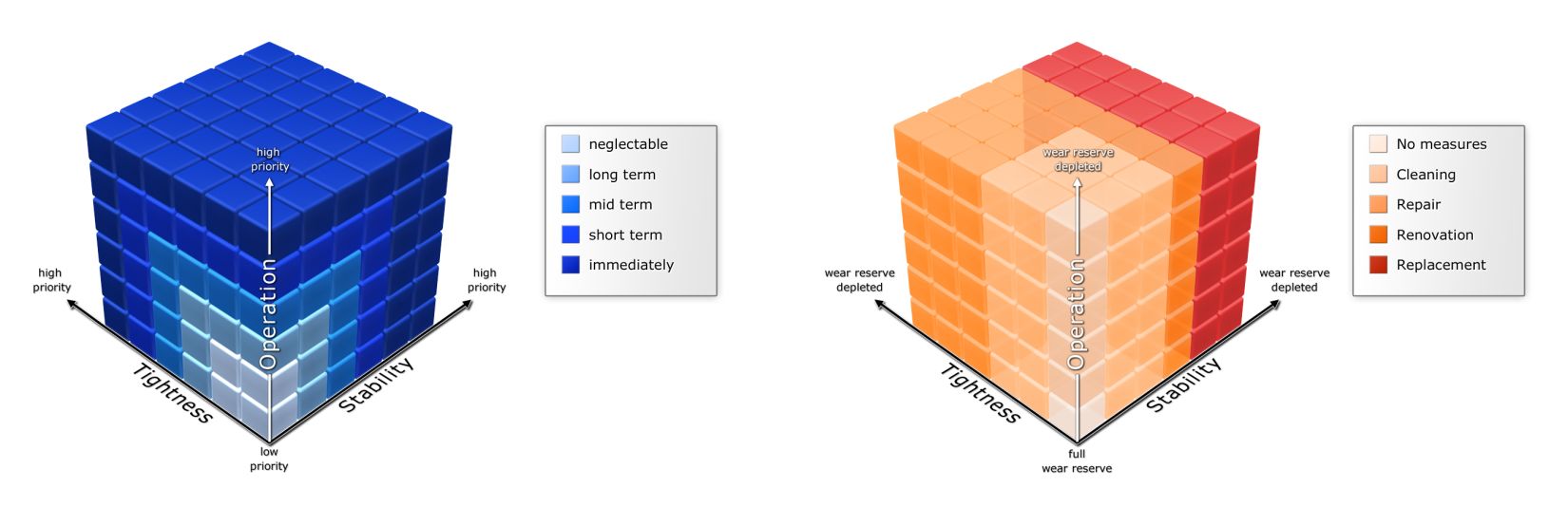 Within STATUS the task is settled by the use of decision cubes which form a general decision space for priority and wear reserve. Each axis of the cubes stands for one of the rehabilitation targets, stability, tightness and operation safety. The decision cubes are built according to several rehabilitation decisions of the network operator on potential rehab candidates from the particular network.