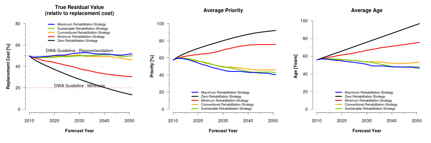 To turn the prediction of the ongoing deterioration from a pure forecasting tool into an instrument for strategic and sustainable planning, the different decisions and the linked rehabilitation actions need to be a part of the forecasting procedure. That way it is not only possible to forecast the future ageing of the network but also how the ageing behaviour would change if certain rehabilitation decisions were applied, modified, postponed or renounced. The forecast of multiple possible but different rehabilitation strategies offers the chance of virtually rehabilitating the network, monitoring the effects, analyzing the results and selecting the most appropriate rehabilitation strategy according to the network operator’s predefined demands or iteratively forming an optimized strategy. This ex-ante check of the future rehabilitation strategy could lead to more sustainable rehabilitation planning but it definitely gives long-ranging planning security.