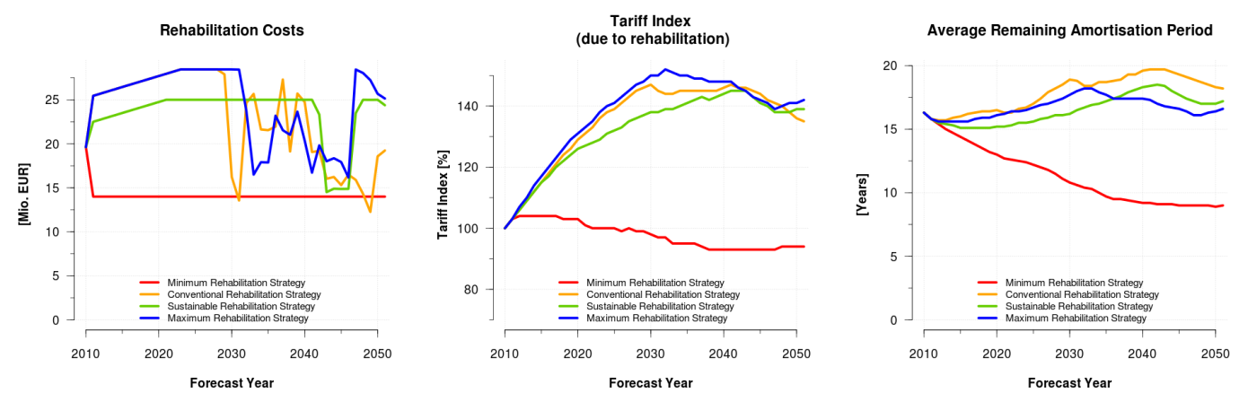 After the finalization of all steps, the rehabilitation candidates selected within the particular year of the strategy are “virtually” rehabilitated and the forecast continues with the next year of the strategy. This way the development of various key figures such as asset net value, fees and tariffs and average rehabilitation priority show the sustainability of the strategies analyzed thus giving way to the selection of the most appropriate solution.