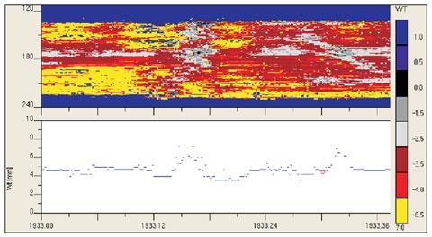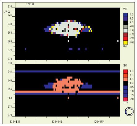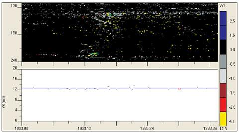 The B-Scan of Figure 4 shows the thickness of the coating. The profile is much better visible as in Figure 3. The thickness of the coating varies from zero to about 3.5 mm.