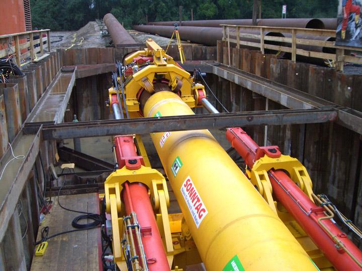 In the rear of the Pipe Thruster, a prefabricated and tested product pipeline is positioned on pulley blocks ready to be thrust forward. Different from pipe jacking or microtunnelling, the DIRECT PIPE® method allows for an installation of the slurry circuit from the start of the project not requiring a delayed installation and successive extension of the circuit: The slurry and pump system is operated parallel to pipe jacking along the entire drive length.