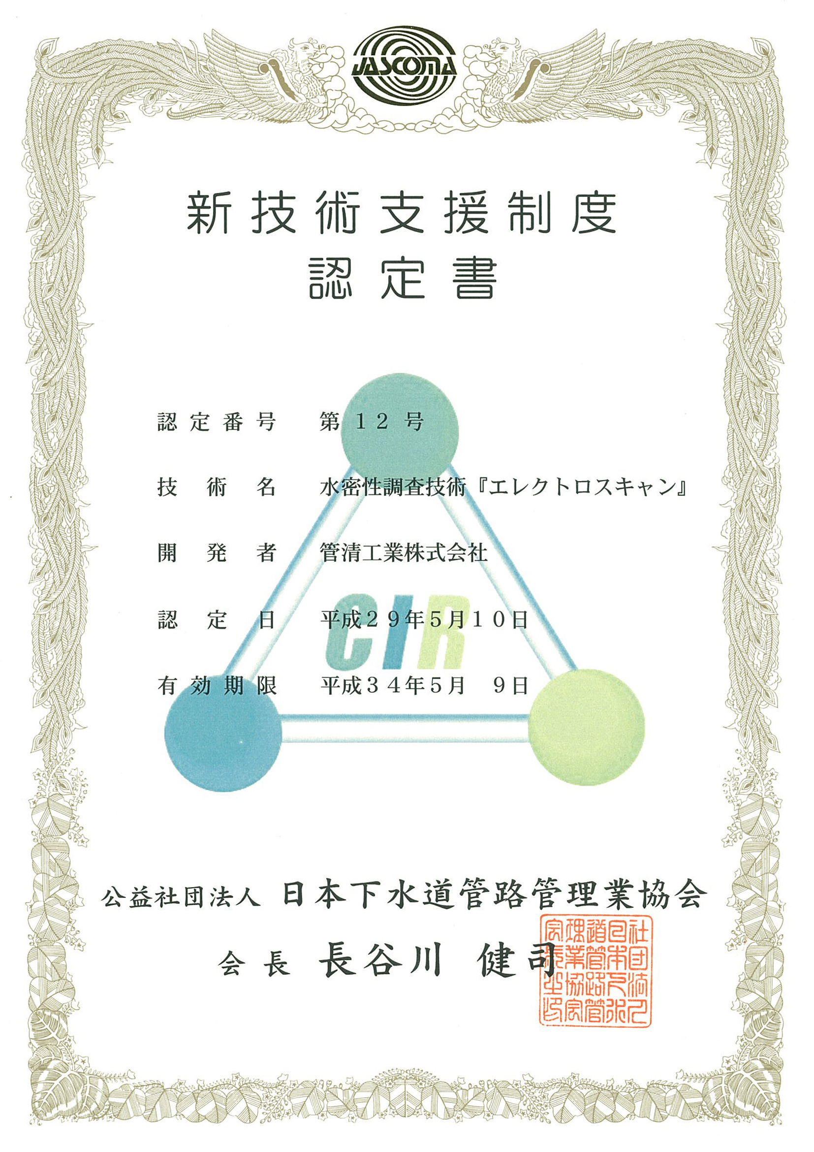Electro Scan Inc. announced today that its Japanese and U.S. patented technology has been awarded JASCOMA Certification No. 12, Water Tightness Investigation Technology, also known as “Electroscan.”