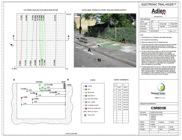If Electronic Trial Holes are being undertaken as a direct replacement for traditional hand dug trial holes, then it may be acceptable to have results drawn up by hand on site, with an accompanying sketch of the ETH location. One approach is to have a pre printed form to ensure none of the essential information is missed. These can then simply be filed for retrieval at a later date, or returned to a drawing department for digitising. The best option though is to provide the means to draw then up electronically on site as they are completed. This requires either a mobile CAD office or a laptop with a suitable drawing package, preferably GIS enabled. This will reduce your potential for creating draughting errors during copying and make the information more widely available in a shorter time. It is also important to consider the reasons why the Electronic Trial Holes have been commissioned. If the reason is for example; confirmation of the Water records, it may not be necessary to locate all services in the ETH area. It would however be extremely important to ensure that this was noted on the completed records to ensure that it could not be assumed that no other services were present because they were not shown.