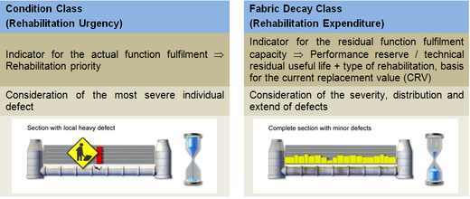 In order to reach an assessment of the structural/operational object condition that is as realistic as possible, an extended assessment concept has been integrated in STATUSSewer, which subdivides the subsequently explained assessment of a sewer section into a condition class and a fabric decay class (Figure 6) [13].